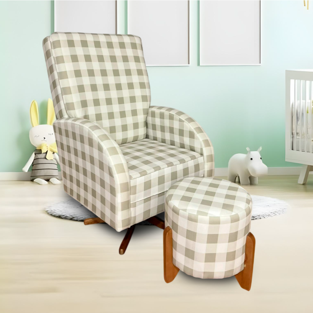 A Poltrona Maria Laura é uma opção elegante e muito confortável para o quartinho do bebê. Com encosto em espuma soft, base nas opções balanço e giro e fixa balanço vai com o puff Maite incluso.